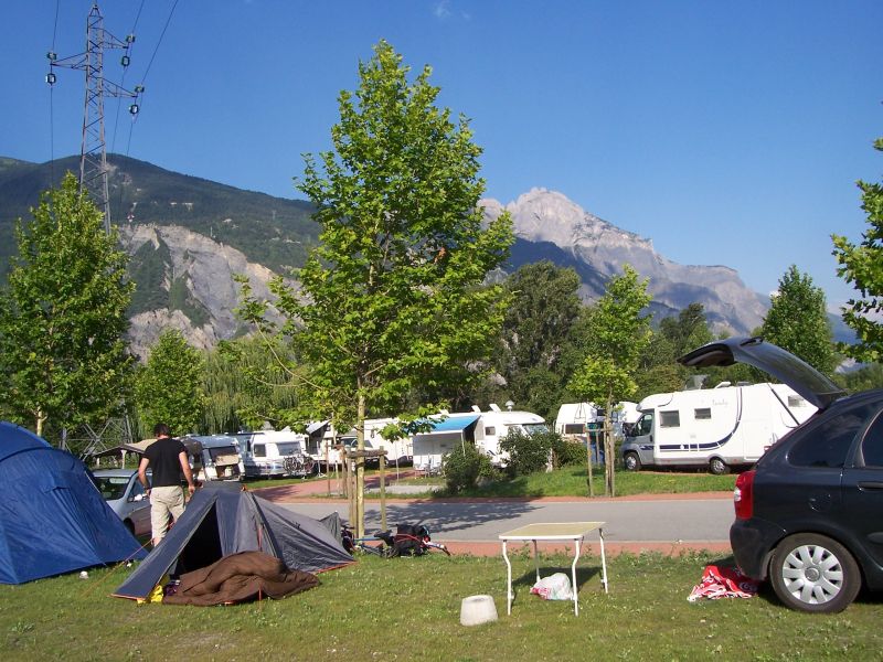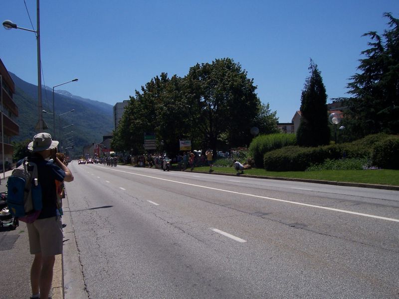 Ich fuhr nach Albertville früh los, denn ich dachte wegen des Sprintes (PMU) der Verkehr schon zeitiger umgeleitet wird und viele Besucher kommen. In kaum einer Stunde erreichte ich die Stadt bei der Abfahrt von 40 km. Eine gute Durschnittsgeschwindigkeit ! Meine Ehrenrunde machte ich in der Stadt der Winterolympiaden 1992. Im Park frühstückte. Anschliessend suchte ich einen geeigneten Platz vor dem Sprint auf der Hauptstrasse, woher ich gut fotografieren konnte. Etwa vier Stunden musste ich auf die Fahrer warten, aber 2 Stunden vor der Ankunft des Feldes fingen an, die Fahrzeuge der ungefähr vierzig Sponsoren vor uns vorbeizufahren und Geschecke zu "streuen". Der Platz eignete sich zum Fotografieren nicht mehr, denn die Sonne wendete sich und als Gegenlicht schien. Aber meine Digitalkamera liess ebenfalls die schnell aufeinander folgenden Exposizionen nicht zu. Nach dem Sprint kamen vereinzelt noch ausgerissene Fahrer vor dem Feld. Nun kamen die Verfolger an. Bald näherte sich das Feld an uns, lang vezogen. Schliesslich war auch das Heer der Begleiter vorbei. Schnell packte ich meine Sachen, denn ich musste noch etlichen km fahren und das nächte Kemping finden. Zuerst radelte ich im Isere-Tal in der Hitze. Dann kam die Landschaft von Maurienne. Dort konnte ich mich nur auf die guten Absichten des Inhabers verlassen, denn der Kempingplatz war am Nachmittag schon voll. Angeblich war ich sein erster Gast aus Ungarn, so spazierte er mit mir auf dem Camping des Grand Cols "Kemping der grossen Pässe" herum, um schliesslich eine Stelle zwischen den Spaniern und der Familie aus Holland zu finden. Der Kempingplatz war voll mit den Schildern der Pässe der Umgebung, die meisten lagen über 2000 m. Dritter Tag