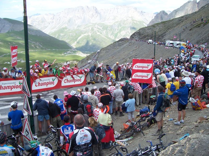 Nachdem das Pflichtfoto durch einen Radfahrer geschossen war, suchte ich einen Platz meinem Fahrrad, denn mir schien kaum noch Platz zu sein. Hätte ich den sieben Stunden späteren Zustand vorsehen können ! Ich legte mein Rad in der Nähe der Bergwertung zum Hang. Da ich klein bin, suchte ich mir einen Felsen am Hang aus, woher ich über die Zuschauermenge fotografieren konnte. Ich sass sieben Stunden auf dem Felsen bewegungslos, denn überall kleine Steine ein Geröll bildeten. Almählich wurde die Passhöhe dicht bevölkert: über mir viele Örtlichen und Spanier sowie eine italiänische Fotografin, die später eine teuere Kamera fallen liess. Sie rutschte nach ihr, eine kleine Lavine verursachend. Dann stellte truimpfierend fest :German qualitiy it is working ! Mit ihrer Kamera baumelnd kletterte sie zurück. 20 m von neben mir waren Amerikaner, die diese Ansteigung gering schätzten, behauptend in Tour of Georgia gibt es auch 22 %-ige Ansteigung. Nun sah ich in der Ferne noch eine ernom lange Fahnenstange auf der Spitze eine kleine und weiter unten eine grosse ungarische Fahne. Offensichtlich waren Fans aus Siebenbürgen. Dann legte sich der Ansturm der Werbefahrzeuge, immer lauter werdend und immer mehr Hubschrauber flogen näher. Die ungarische Fahne legte ich neben mir. Jedoch kam sie nicht in die Sendung, denn ich war etwa 20 m von der Zielinie der Bergwertung entfernt. Endlich konnte man sie,eine kleinere Fahrzeugkolonne in der unteren Kehre sehen. Die Tour ist angekommen ! In der unteren Kehre konnte man sehen, dass nur ein Fahrer kam. Einer der beiden deutschen Radler unter mir sprach französisch, und aus der Rundfunksendung teilte uns mit, dass der Kolumbianer, der junge Bergspezialist Mauricio Soler mit drei Minuten Vorsprung kommt. Aber in der ersten grösseren Gruppe der Verfolger befanden sich Rassmussen,Contador,Sastre, Andreas Klöden,Moreau und noch andere Favoriten.