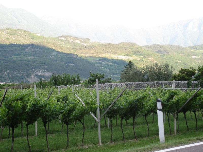 Passo Giau erwartet die Bergwertung Passo Fedaia geschafft die andere Seite von Fedaia II. Tag .23.06. ~.123km Pozza di Fassa -12km(SS48)-Moena-14-Cavalese-46 km--Civezzano-9km-Trento- Ausruhen in der Mittagshitze in Trento an einem Brunnen.. 22km-Monte Bondone**(BIG)1654m, Höhenunterschied:1463m,Lasino-Caravino-Sarche-Pietra Murata, Camping Daino wunderschön ist die Aussicht, Felsenschichten als Ausgleich zum Schinden. Aus der Höhe so sieht Trento aus -20 km Abfahrt Dann überqueren wir einen Weinberg und kommen wir nach Pietramurata.