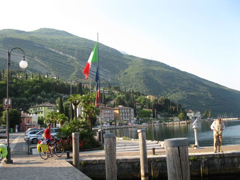 Hafen Riva del Garda Seeufer mit Zypressen Segelyachthafen Auf passo Telegrafo kletternd . Ehrlich gesagt ich habe mein gut beladenes Rad über die 4 km lange 17 %-er Ansteigung in der Hitze geschoben. Trotzden habe ich mächtig geschwitzt.