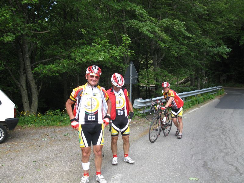 Bartalis erster Sieg Bartali herrscht die Pyrennen weltberühmtes Foto von Coppi und Bartali Bartali und Coppi 1953 Giro di Toscana Passo della Consuma 1050 m auf der Passhöhe, Papiano-5km- Camping Falterona in 836 Meter Höhe. Bis 10 Uhr am Abend erreichten wir den Zeltplatz. Am Ende der Strasse 1.5 km Schotterweg im Stockfinsternis VI. Tag 27.05..: 90 km Camping Falterona-4km-Papiano-12km-Passo della Calla** 1296 m, Höhenunterschied. 827 m aus Stia 15,4 km-27km-Santa Sofia-16km-16km-Corzano-4km-Bagno di Romagna-11km-Verghereto-13km-Monte Fumaiolo**(BIG1400m,Höhenunterschied.:820m)-3km-Verghereto, Balze Camping Tiber. Übernachtung 12€/fõ Die karakteristischen Blumen des Apennin Forellen- und Lachszucht !!. Auf den abwechslungsreichen Landschaften des Apennin gibt es keine eine km lange Strecke ohne Ansteigung oder Gefälle! Bergsdörfer Steinschichten. Unser Kirschbaum , der uns mit Kirschen versorgt hatte. Passo del Carnaio auf 760 m. Erneuter BIG geschafft: Valico_Monte_Fumaiolo mit László und das 1400 m Schild mit mir.