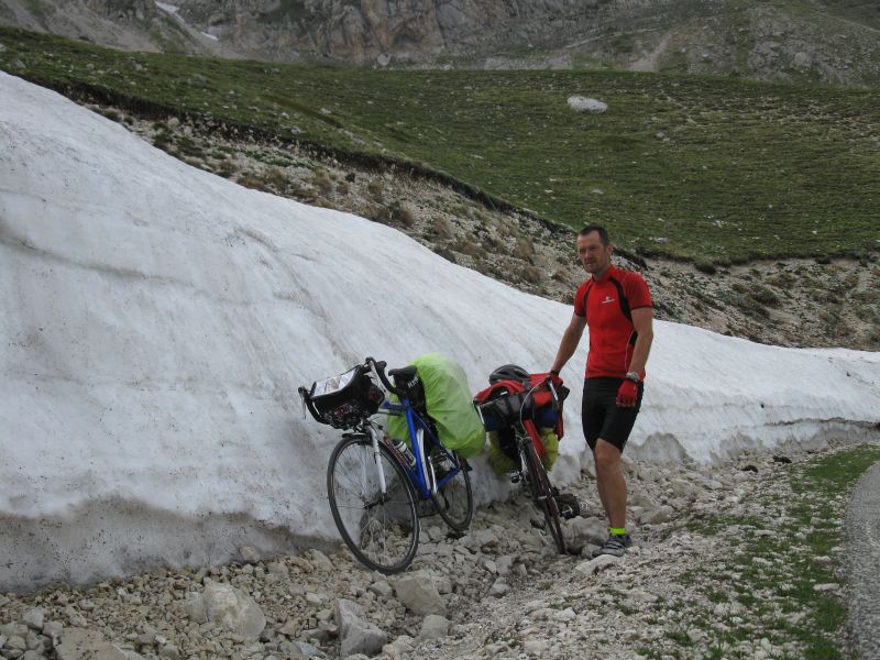 1-2 km vor Campo Imperatore Laci auf der Höhe schliesslich erreichte ich die Höhe Laci badet sich im Schnee oder doch nicht?. Dorther kamen wir . Abfahrt, bei der Suche auf Privatunterkunft stiessen wir auf solche Strasse in Filetto. XI. Tag 01.07 119 km Pagánica-26km-Rocca di Cambio-4km-Campo Felice Skizentrum-4km-Rocca di Cambio-25km-Celano-12km-Avezzano-11km-Capistrello-23km-Campo Staffi** 1779 m 1040 m Höhenunterschied- 14km-Filettino. Unterkunft für 30 € pro Personen in der Herberge Girasole dei Monti Simbruini. Mir unbekante Baumart. Rocca di Cambio der Pass im Regen, Laci auf der Passhöhe . Die nach dem Erbeben gebauten Häuser. Laci auf Campo Felice im Regen. Schliesslich habe ich es auch geschafft !! Die Burg von Capistrello und der Hauptplatz , eine enge Gasse. Städchen in den Bergen, eine Stadt. Campo Staffi das menschenlere Skizentrum.Laci behebt einen Platten oder Speichenbruch ?